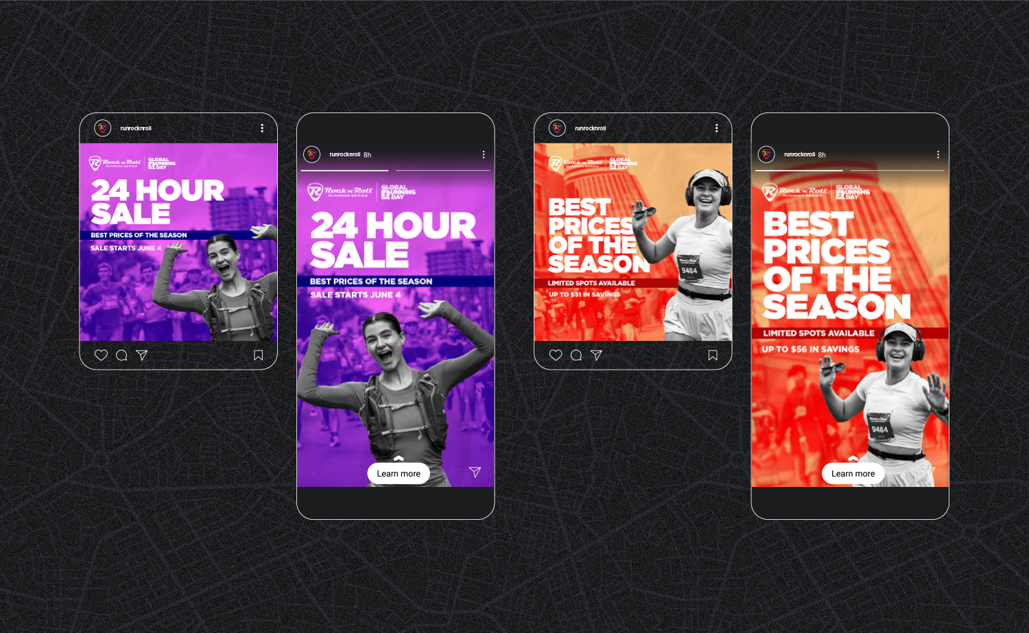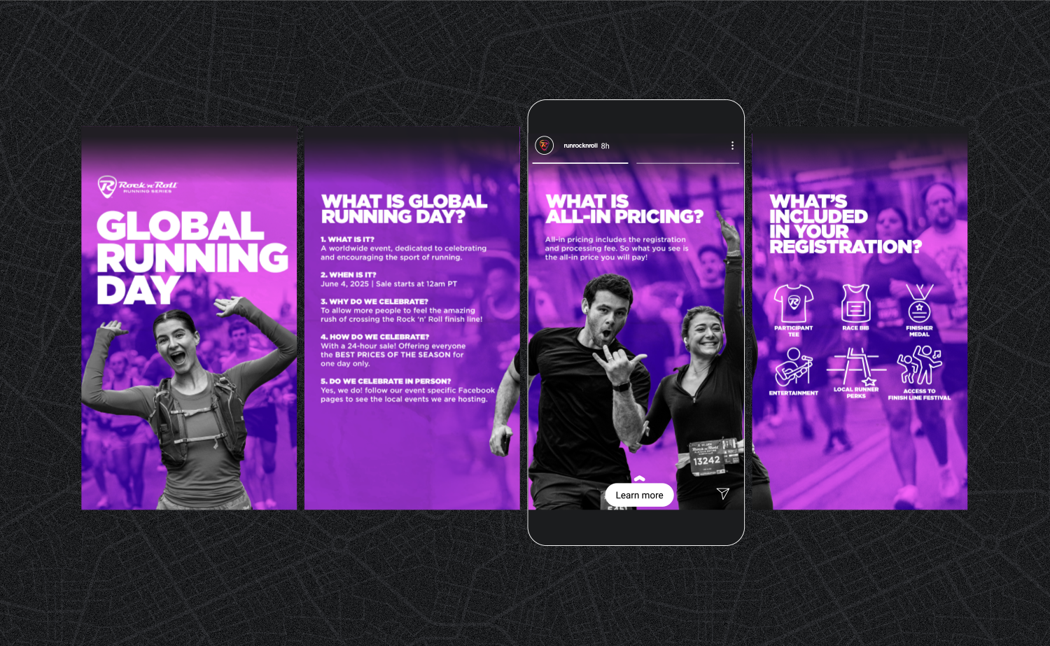 For Global Running Day, I worked with the Rock ‘n’ Roll Running Series team to create a vibrant, high-energy campaign that celebrated the global running community. My role involved developing a cohesive visual direction that captured the brand’s signature fusion of fitness and music, while also emphasizing inclusivity and celebration. I designed a suite of digital assets, including social media graphics, email headers, and animated content that highlighted the Rock ‘N’ Roll Running Series runners and encouraged participation through bold typography, dynamic layouts, and rhythmic visual elements. The campaign successfully amplified engagement across platforms and reinforced the brand’s identity as a movement that brings people together through the power of running and rock.